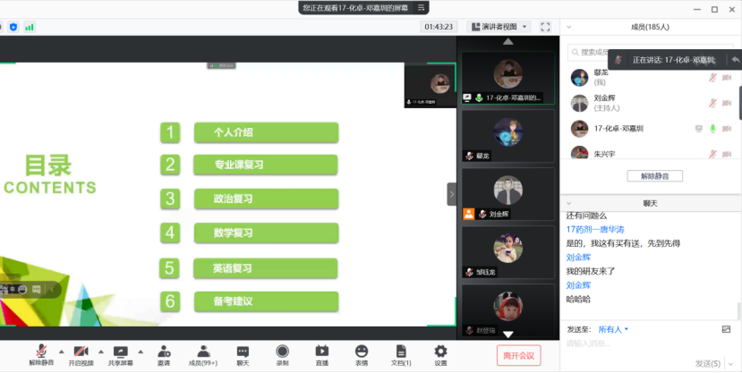 保研华南理工大学的林浩烽学习成绩专业排名第二,曾获全国大学生化工设计竞赛一等奖、全国“互联网+化学反应工程”课模设计大赛三等奖等,他重点介绍了保研的流程和具体细则,告诉同学们既要保证学业成绩优异,也要注重参加科研实验和各类竞赛。考取华南理工大学的刘金辉等7位同学分别介绍了学校专业、各科备考过程中的技巧、复习资料的准备等情况,建议同学们制定好适合自己的计划,打好学习基础,保持良好的学习心态,不要过于自信也不要妄自菲薄。