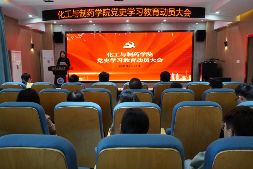本网讯(通讯员 沈霁月)3月25日下午,化工与制药学院在大化工楼610报告厅召开党史学习教育动员大会,学院全体教职工党员和学生党支部委员参加会议。会议由学院党委副书记周丹主持。