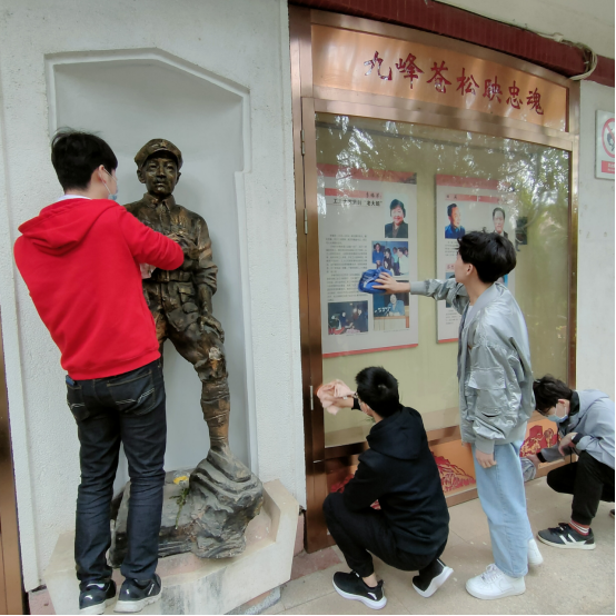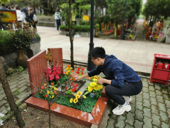 向翼凌老师发言毕,全体党员默哀三分钟。在陵园肃穆的气氛中,所有党员用庄重表达哀悼,用寂静刻画敬重,用无声之言,互通缅怀。随后,同学们在烈士纪念碑及党旗前举起右手宣誓。同学们自发为这些为了革命、为了国家埋骨异乡,叶落未归根的烈士们清洗烈士墓碑,为他们拂去落叶,擦去尘土,让烈士们纵使葬于异乡,也能安心长眠。
