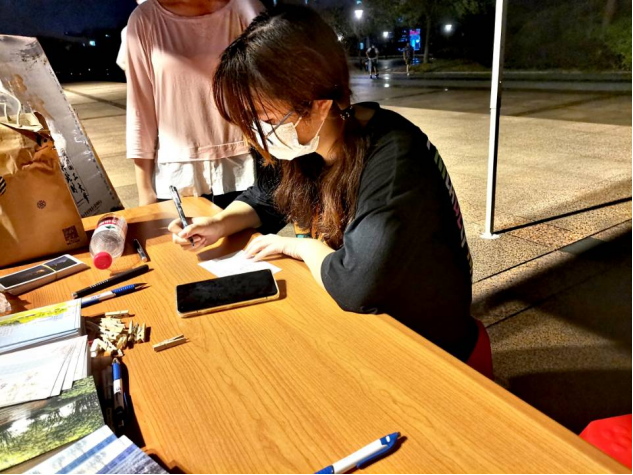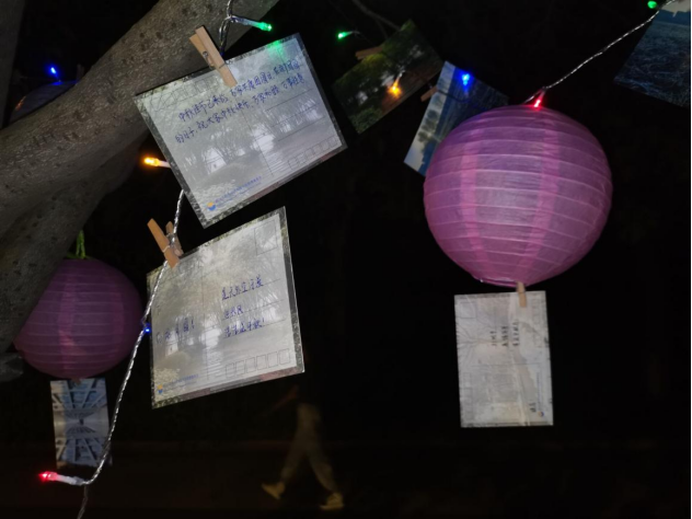 与此同时,线下“灯影映轮月,满愿衔枝头”活动正有条不絮的进行。线下活动分三个部分:图书馆大厅赏文创纸雕灯、图书馆门口摆点处领取明信片寄语、心愿树下挂寄语祝福。图书馆大厅内充满节日氛围的纸雕灯悬挂于空中,引得不少同学驻足观赏。馆外路过的同学纷纷前来领取明信片,并写上对自己、家人与祖国的美好祝福,并将其挂在心愿树上。皎洁的月光洒落在枝头上,伴随着树枝上盘绕的一串串闪光的氛围灯,还有悬挂于枝丫间的明信片与树下祝福的同学们,此情此景显得格外浪漫朦胧。
