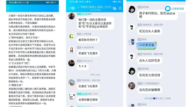 本次中秋灯会线上活动分为“赏中秋圆月,闻月夕万俗”、“工大无处不飞花”飞花令、“摘星文虎”猜灯谜、“转发说说随机抽奖”四个部分,线下活动为“灯影映轮月,满愿衔树头”。