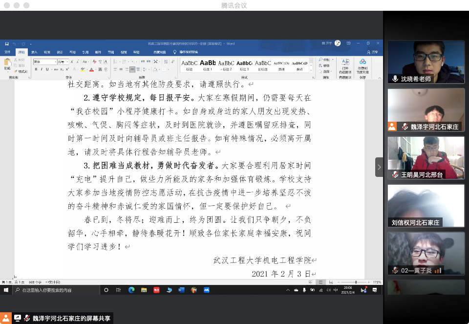 学院河北籍研究生张子龙、辽宁籍研究生石欣平因疫情原因留汉、留校,两位研究生的导师帮助解决其居住地点,每天联系和关心。2月3日上午,学院党委书记李芳、副书记李俊、辅导员张聪老师和导师一起专程看望两位研究生,并与学生家长们连线视频交流。党委书记李芳代表学院告知他们学生目前在汉情况良好,请他们放心,预祝他们全家和谐美满、过一个祥和愉快的春节,同时希望能家校联合让学生留汉过一个安全祥和的春节。学生在汉期间有任何困难,可以随时与学院联系,学院会尽最大力量解决他们的实际困难。