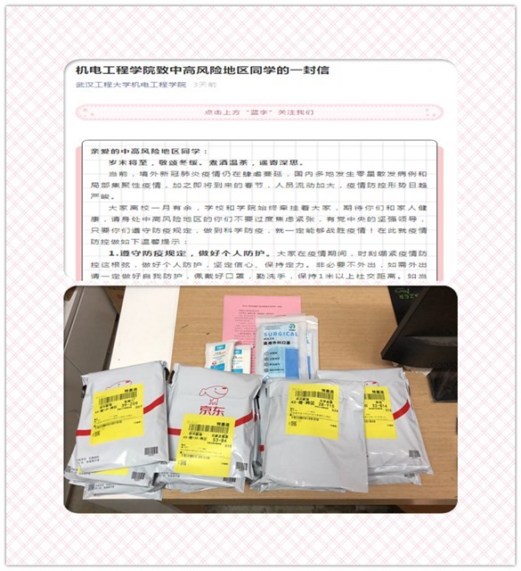 为指导同学们做到居家科学防疫,克服焦虑心理,增强必胜信心,学院在贯彻落实研工部、学工部工作要求,严格落实“日报告、零报告”制度的同时,还专门向每一位中高风险区学生都快递寄送了《机电工程学院致中高风险地区同学的一封信》和防疫爱心礼包(含医用外科口罩、酒精湿纸巾)。