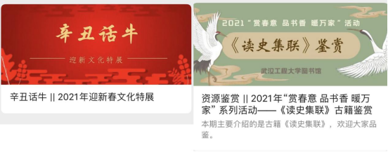 本网讯(通讯员 范玉璟)为深入贯彻落实习近平总书记给国图老专家回信精神,充分发挥图书馆“滋养民族心灵、培育文化自信”的重要作用,加强文化传承和社会服务力,在疫情防控常态化形势下丰富春节期间广大读者的精神文化生活,我校图书馆积极响应中国图书馆学会、国家图书馆号召,开展2021年“赏春意 品书香 暖万家”主题系列活动,整合中国年俗文化活动春节资源数字礼包,包括展览、楹联文化古籍资源、精选楹联、国图公开课等,将国家图书馆优质资源惠及我校广大读者,共享文化盛宴。
