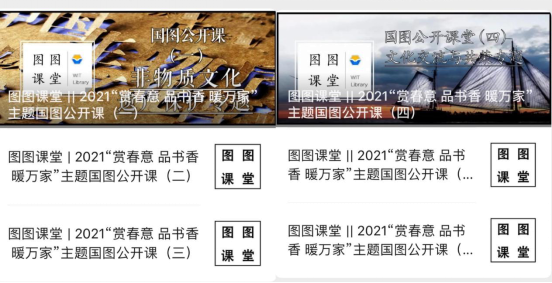 此次活动主要在线上开展,图书馆通过微信公众号、官方QQ等途径整合各类图文资源,连续推出了9期“赏春意、品书香、暖万家”主题内容,如图书馆图图课堂栏目精选了100场212集国图公开课精品讲座,内容包含非物质文化遗产保护专题、文学鉴赏专题、艺术欣赏专题、文化交流与共荣专题、教育专题、科技专题等,为读者的假期生活增添知识趣味。
