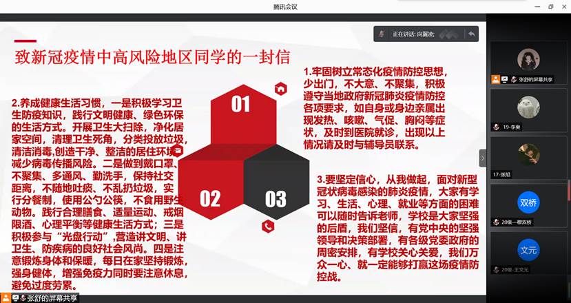最后学院党委副书记向翼凌宣读致中高风险地区同学的一封信,提醒同学们要牢固树立常态化疫情防控思想,养成健康生活习惯,坚定成功抗疫的信心,对学生进行感恩教育,感恩父母,感恩社会,表达了对疫情中高风险地区学生的关爱与慰问。