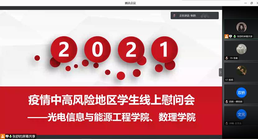 本网讯(通讯员 张舒 李奥)为方便老师及时倾听学生在疫情期间的生活情况及遇到的困难。2021年2月8日晚19:30光能数理学院在腾讯会议组织了对家在河北省、辽宁省等中高风险地区的学生的线上慰问活动。学院党委副书记向翼凌,学工办全体辅导员出席本次活动。