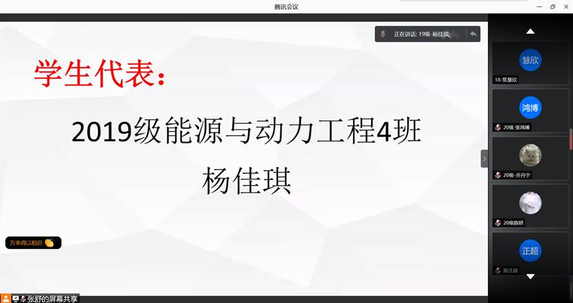 首先,各个年级的学生代表依次分享他们在防疫期间的所思所感,介绍了自身以及家人状况,讲述了回家自疫情以来的生活情况。其中杨佳琪同学还分享了其积极参与人工智能培训以及自己的学习心得分享等等,积极的学习丰富自己的生活,为自己人生的成长旅途又增添了一抹亮色。