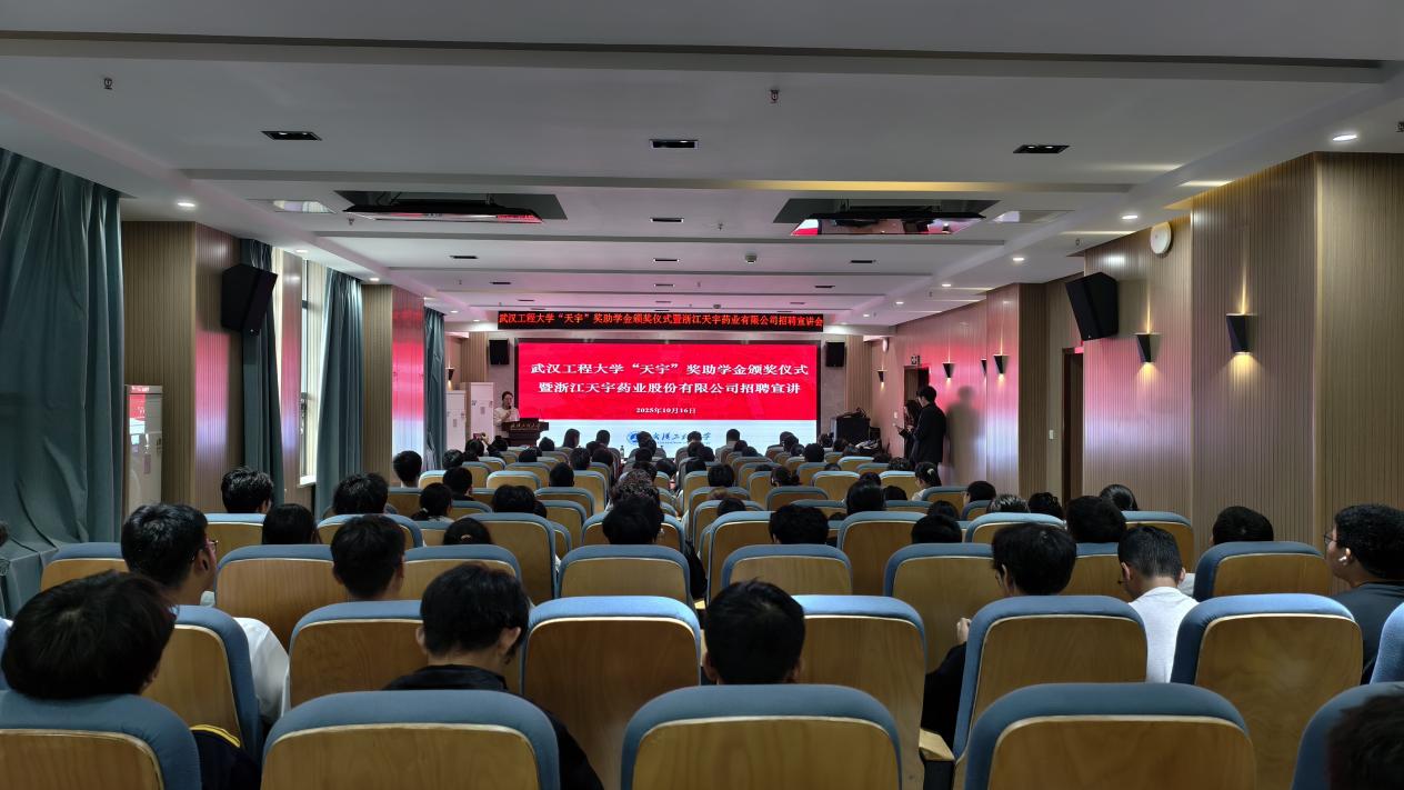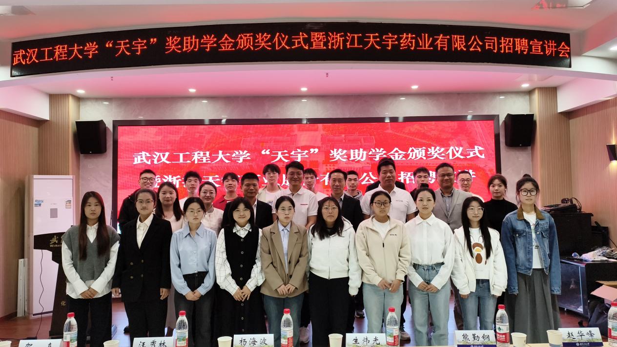 本网讯(通讯员 张锦 张宇轩)10月16日下午,学校“天宇”奖助学金颁奖仪式暨浙江天宇药业股份有限公司招聘宣讲会在流芳校区隆重举行。浙江天宇药业股份有限公司人力资源高级总监生炜光、质量控制总工汪秀林、生产经理赵华峰,化工与制药学院党委书记杨海波、院长熊勤钢及师生代表共同出席仪式,仪式由化工与制药学院党委副书记周丹主持。