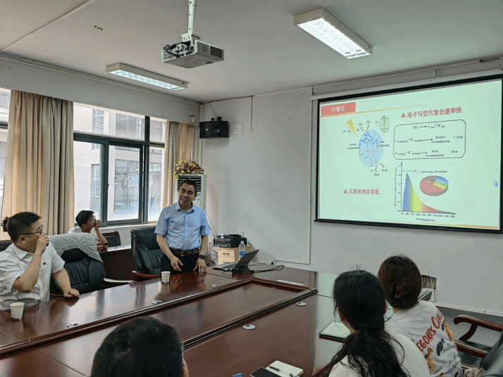孔海霞对王传义教授的到来表示了热烈欢迎,并简要介绍了王教授的研究领域及学术成果。随后王传义教授做了题为《缺陷微结构调控与光催化增强效应》的报告,他以太阳能为驱动的光催化技术为核心,指出其大规模工业化应用的两大制约因素,即材料的光响应范围和光子利用率,这两大因素与材料的结构和表界面过程紧密相关。王传义教授及其团队在光催化材料缺陷微结构调控及分子水平上理解其表面界面过程方面开展了一系列工作,这些工作为我们理解和应用缺陷微结构调控增强光催化提供了借鉴。