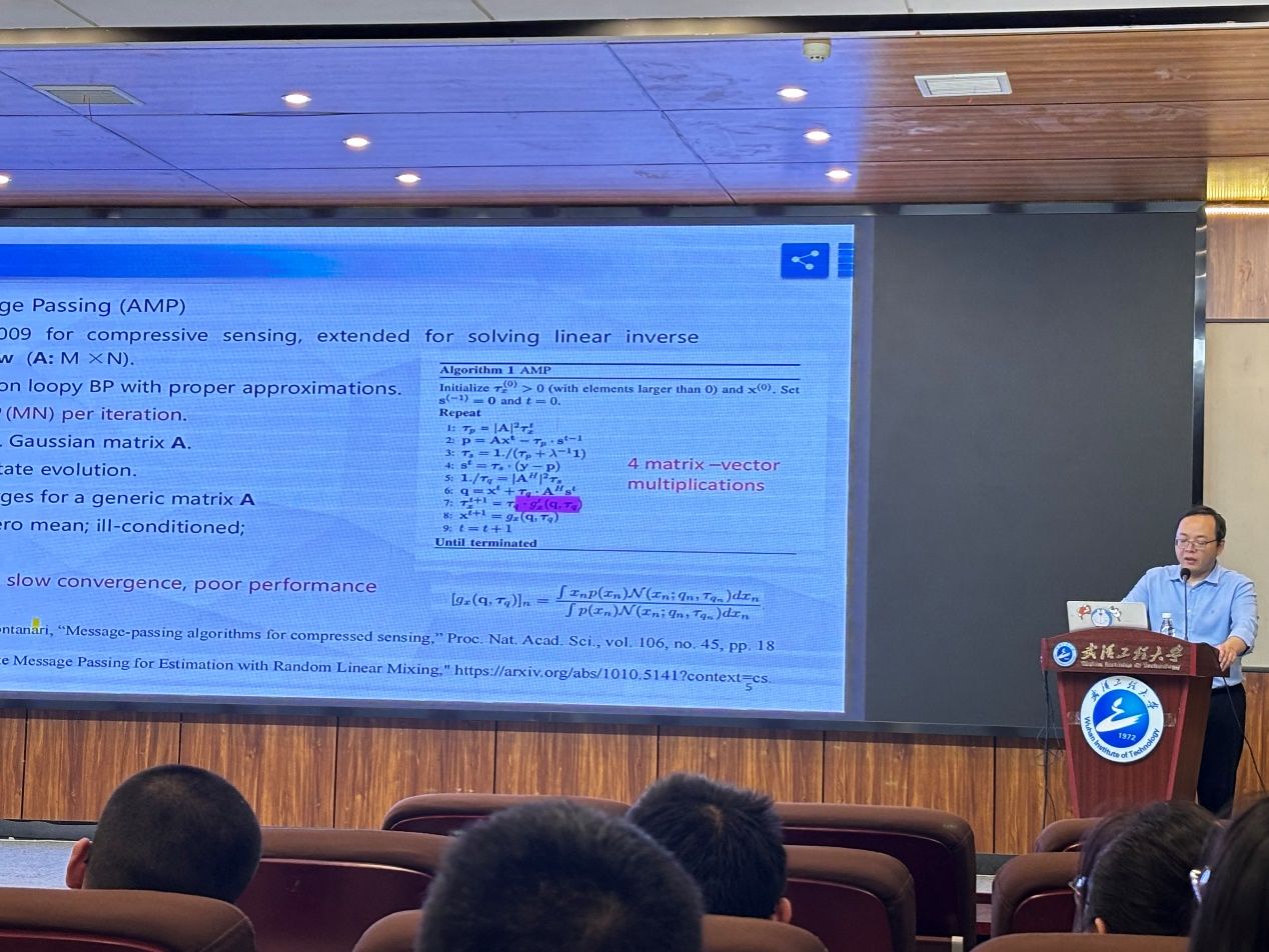 在现场答疑环节,郭庆华副教授与在场的师生对信号恢复问题中UAMP算法的通用性和对白噪声信息恢复问题适用能力展开讨论,对UAMP算法在矩阵补全领域的应用提出了假设和疑问,郭庆华副教授在场热情地解答了师生提出的相关问题。
