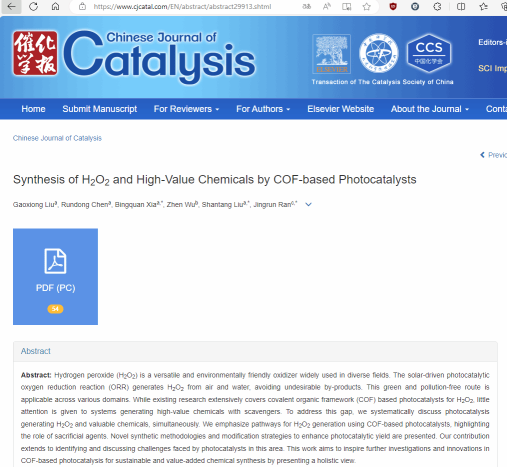 本网讯(通讯员 程然)近日,化学与环境工程学院2022级研究生刘高雄以第一作者在国际知名期刊《Chinese Journal of Catalysis》(中科院一区Top期刊,影响因子16.5)发表了题为《Synthesis of H2O2 and High-Value Chemicals by COF-based Photocatalysts》的学术论文,尊龙凯时人生就是博为第一署名及通讯单位,化环学院刘善堂教授和青年教师夏兵全为论文通讯作者。