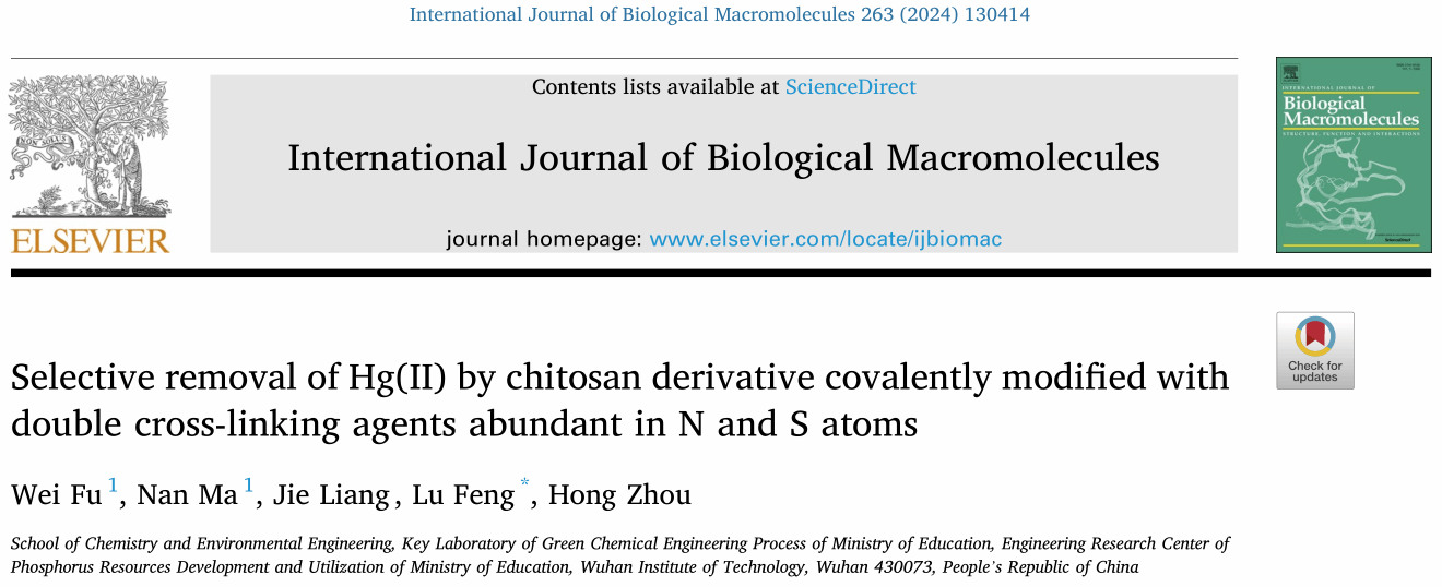 本网讯(通讯员 冯露)近日,化学与环境工程学院环境工程专业2021级本科生付玮以第一作者在国际知名期刊《International Journal of Biological Macromolecules》(中科院一区Top期刊,影响因子8.2)发表了题为《Selective removal of Hg(II) by chitosan derivative covalently modified with double cross-linking agents abundant in N and S atoms》的学术论文。化环学院青年教师冯露博士为论文独立通讯作者,尊龙凯时人生就是博为第一署名及通讯单位。