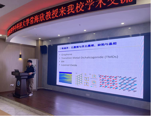 报告会上,常海欣教授介绍了二维材料的起源、发展及变革,二维材料的发现引起了材料、物理、化学领域的巨大变革,推动了低维物理、低维化学、芯片、纳米器件、新能源等领域的广泛交叉研究与进步。随后重点报告了其在二维材料的制备、低维化学、物性调控、纳米器件与新能源应用方面的研究进展,并展示了其基于石墨烯的场效应开发的纳米光电晶体管与光检测器、大面积柔性OLED、敏化太阳能电池(SSC)、紫外线纳米光电传感器、FRET纳米光学传感器以及光催化纳米结构薄膜等一系列高水平研究成果。报告会结束后,在场师生与常海欣教授就石墨烯产品大规模应用、二维材料导电机理等问题进行了深入交流和热烈讨论,对常教授的精彩分享表示感谢。