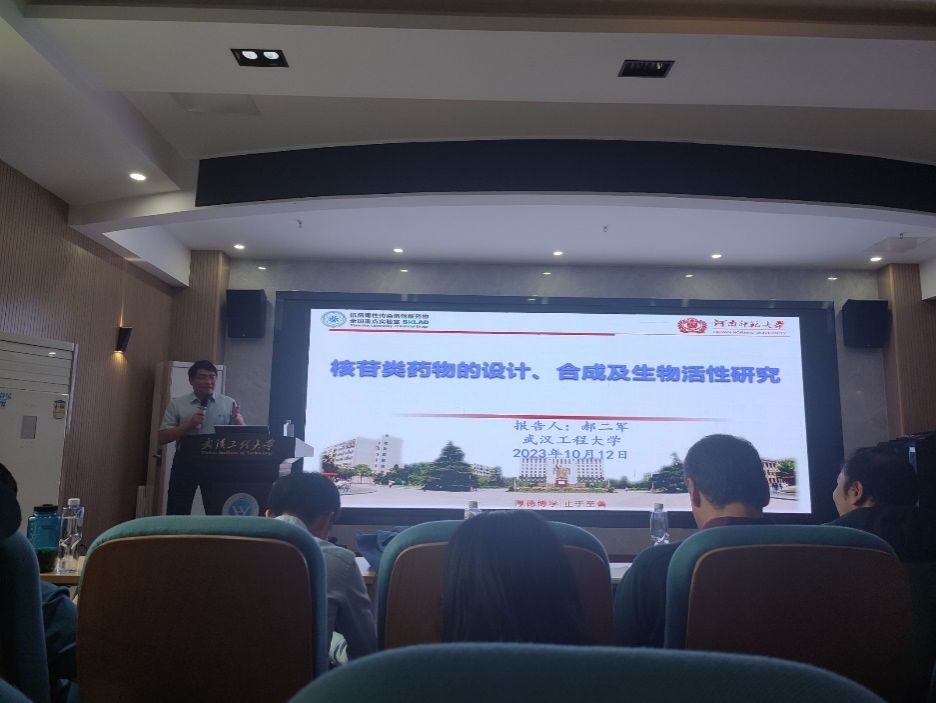郝二军教授以《核苷类药物的设计、合成及生物活性研究》为题向大家介绍了核苷类药物在抗病毒、抗肿瘤治疗药物方面不可替代的作用和地位,同时向大家展示了课题组近期在核苷类药物的设计、合成,通过对抗肿瘤活性研究分析了该药物可作为候选药物的实际价值。最后,郝教授向大家分享了在药物设计、合成及生物活性研究过程中遇到的困难(例如研究周期长等问题),同时鼓励在场学生不要放弃每一个反应中存在的副产物。