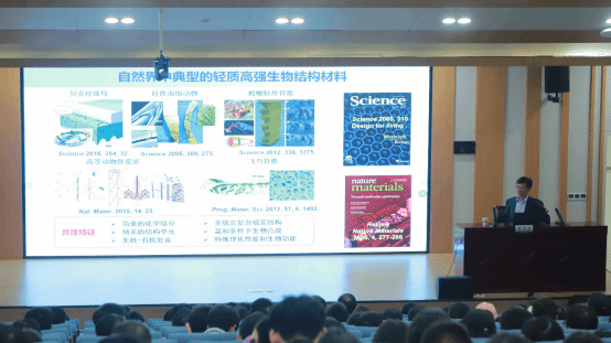 俞书宏院士以“创新研究与人才培养”为主题,结合自身求学及科研经历,从材料对社会发展的重要作用以及与制造业的密切关系开篇,指出“一代材料,一代产业,新材料产业发展水平代表着一个国家先进制造业水平”。受大自然万物生长的启发,他意识到仿生材料学是一门多学科交叉前沿的新兴学科,蕴涵发现、发明、创造的机会,他形容大自然就像是一个先进的“合成工厂”,不断制造出具有各种奇异功能的生物材料或生物体,人类对贝壳、骨骼、牙齿、磁小体、硅藻等生物矿物的研究已逾百年,通过对生物矿物微观结构的细微观察和深入研究,认识到多级有序结构对材料宏观性能的提升能起到至关重要的作用,从而开启了对仿生结构材料的研究。通过对这些生物材料的结构和性能研究,能为人们在微尺度上的仿生材料设计开辟新的途径。他通过大量图片和数据向现场师生展示了团队的高水平科研成果。对于未来材料的发展趋势,他强调要自觉履行习近平总书记生态文明思想,践行绿色发展理念,保护自然环境,为碳达峰和碳中和目标实现贡献科技力量。