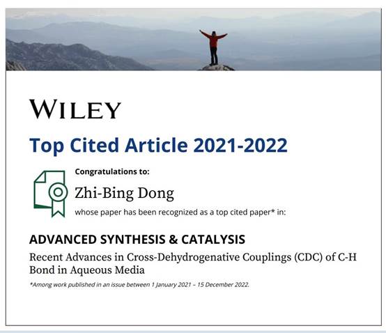 本网讯(通讯员 程然)近期,据国际著名学术期刊出版集团WILEY统计的数据,化学与环境工程学院董志兵教授课题组在国际著名有机化学期刊《高等合成催化》Advanced Synthesis & Catalysis发表的论文“RecentAdvances in Cross-Dehydrogenative Couplings (CDC) of C-H Bond in Aqueous Media”入选Top Cited Article(2021-2022),该论文同时也入选WEB OF SCIENCE数据库高被引论文,论文的第一作者为硕士生彭康。论文链接:https://onlinelibrary.wiley.com/doi/abs/10.1002/adsc.202001358