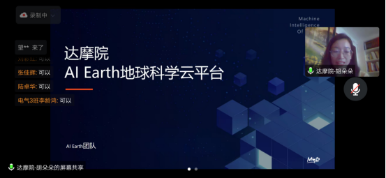 交流会上,阿里巴巴达摩院产品经理胡朵朵团队介绍了达摩院的成立背景、服务宗旨,并对AI Earth地球科学云平台主要定位、核心能力、应用场景和实际应用案例等内容做了详细介绍。AI Earth是一款一站式地球观测智能云服务平台,涵盖数据获取、存储管理、数据处理、分析计算、分发应用、成果输出等多个模块,构建覆盖时空数据全流程对地观测智能应用服务平台。同学们就专业和应用技术方面进行了提问,与胡朵朵团队开展了深入探讨。此次报告紧扣相关学科发展前沿,赢得广泛好评。