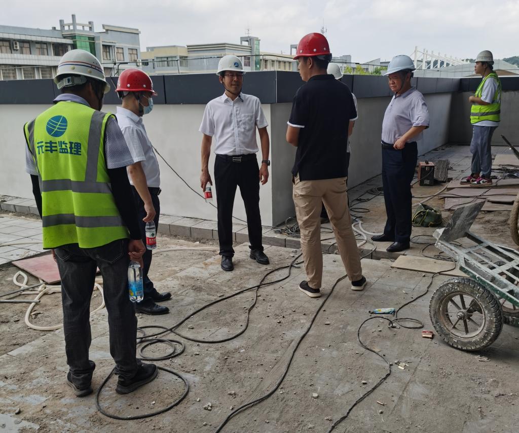 本网讯(通讯员 刘静)7月29日上午,校党委常委马小龙带队深入教育教学综合楼项目现场开展校内预验收工作。浙江省一建建设集团有限公司中南分公司的总经理余小朋、项目生产经理张鹏、总经理助理祝己锐及基建与维修处负责人参加活动。