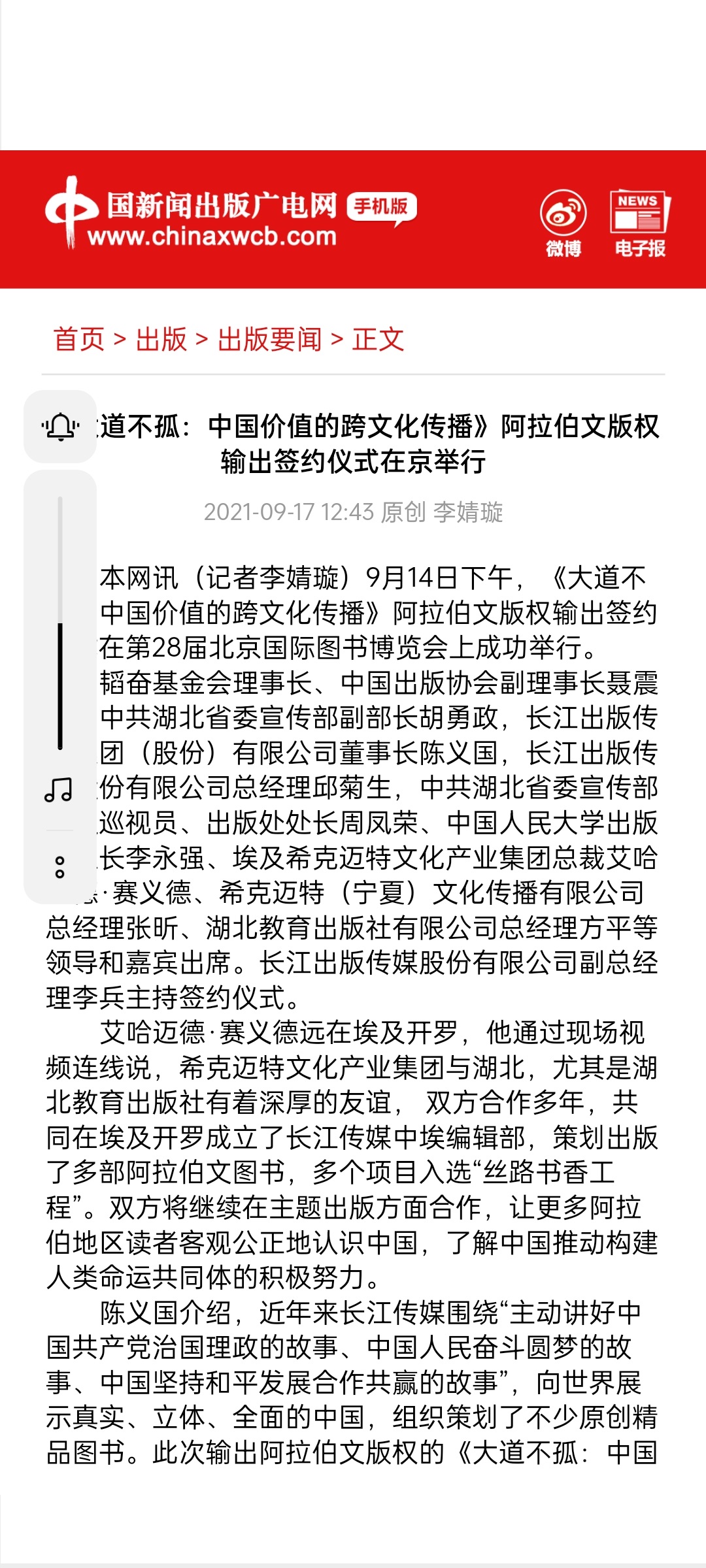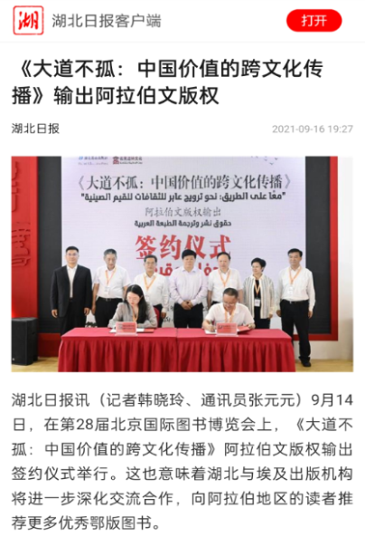 2021年9月14日下午,《大道不孤:中国价值的跨文化传播》阿拉伯文版权输出签约仪式在第28届北京国际图书博览会上成功举行。韬奋基金会理事长、中国出版协会副理事长聂震宁,湖北省委宣传部副部长胡勇政,长江出版传媒集团(股份)有限公司董事长陈义国,长江出版传媒股份有限公司总经理邱菊生,湖北省委宣传部二级巡视员、出版处处长周凤荣、中国人民大学出版社社长李永强、埃及希克迈特文化产业集团总裁艾哈迈德·赛义德、希克迈特(宁夏)文化传播有限公司总经理张昕、湖北教育出版社有限公司总经理方平等领导和嘉宾出席。长江出版传媒股份有限公司副总经理李兵主持签约仪式。(见《湖北日报》2021年9月16日报道:《大道不孤:中国价值的跨文化传播》输出阿拉伯文版权)