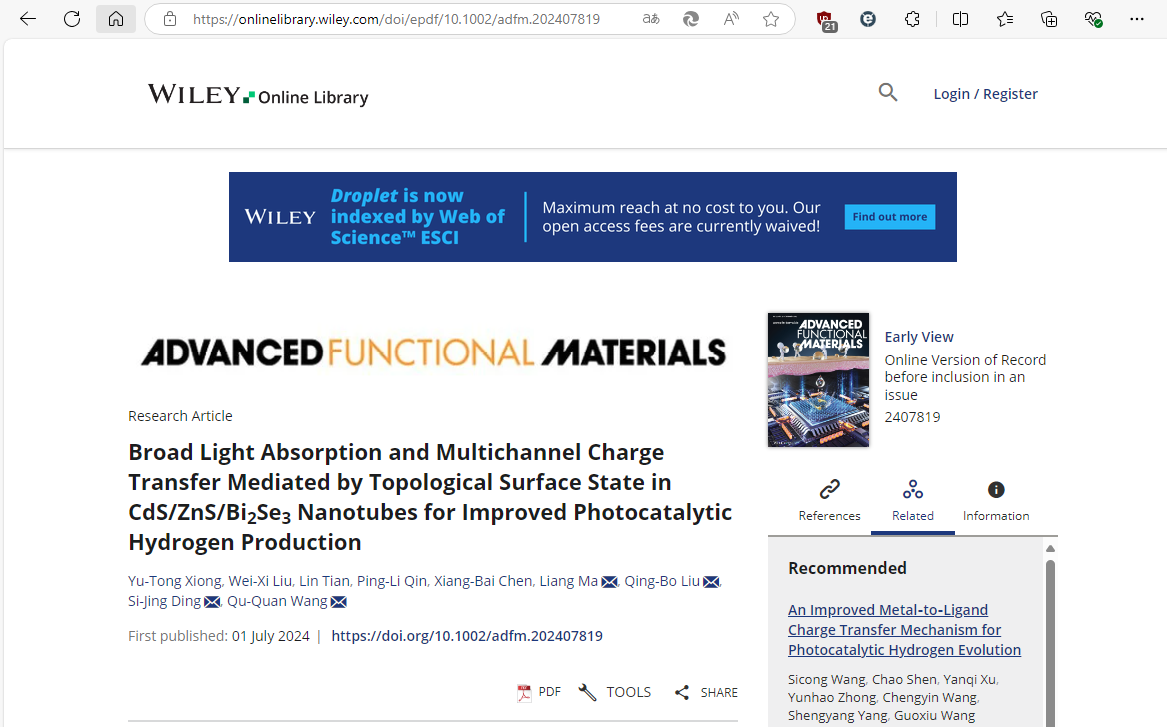 本网讯(通讯员 王蓓 马良)光能数理学院马良老师指导学院2022级本科生熊雨彤等人在国际著名期刊Advanced Functional Materials上发表题为《Broad Light Absorption and Multichannel Charge Transfer Mediated by Topological Surface State in CdS/ZnS/Bi2Se3 Nanotubes for Improved Photocatalytic Hydrogen Production》的研究论文。该期刊为中科院SCI一区top杂志,最新影响因子为18.5。尊龙凯时人生就是博光学信息与模式识别湖北省重点实验室为第一通讯单位,马良老师为第一通讯作者,合作者还有光能数理学院陈相柏教授、中国地质大学(武汉)丁思静教授、南方科技大学王取泉教授。