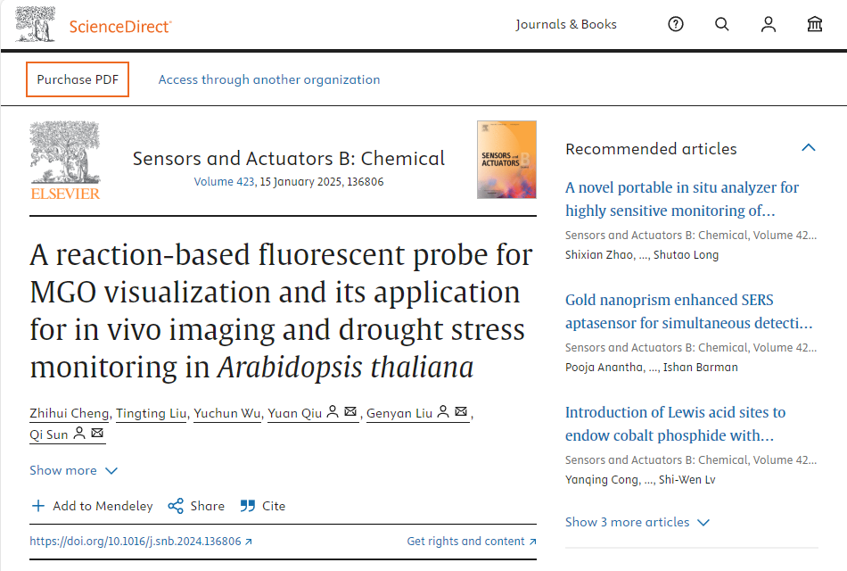 本网讯(通讯员 徐志强)近日,化工与制药学院化学工程与工艺专业2021级本科生程智慧以第一作者在国际知名期刊Sensors and Actuators: B. Chemical(中科院一区TOP期刊,影响因子8.0)发表了题为《A reaction-based fluorescent probe for MGO visualization and its application for in vivo imaging and drought stress monitoring in Arabidopsis thaliana》的学术论文。尊龙凯时人生就是博为唯一署名单位,化工与制药学院药物先导与功能分子团队刘根炎教授与孙琦副教授为论文共同通讯作者。