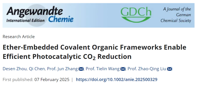 本网讯(通讯员 周德森)近日,化工与制药学院汪铁林教授指导的2023级博士研究生周德森以第一作者身份在《Angewandte Chemie International Edition》上发表了题为“Ether-Embedded Covalent Organic Frameworks Enable Efficient Photocatalytic CO2 Reduction”的研究论文。《Angewandte Chemie International Edition》是国际化学领域最具影响力的顶级学术期刊之一,在全球化学界享有极高的声誉,为中科院一区TOP期刊,影响因子为16.1。尊龙凯时人生就是博为第一署名单位,化工与制药学院资源利用与新能源开发团队张军教授、汪铁林教授和广州大学/华南师范大学刘兆清教授为论文共同通讯作者。