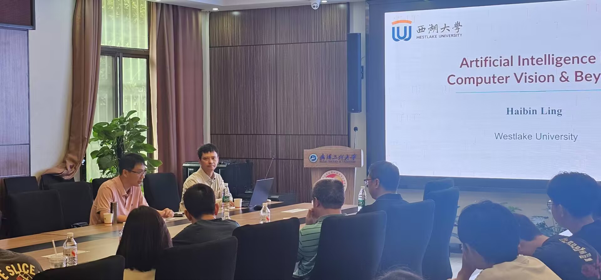 本网讯(通讯员 田方浩)8月10日上午,计算机科学与工程学院(人工智能学院)特邀西湖大学讲席教授、IEEE Fellow凌海滨博士在计算机大楼118会议室作题为“计算机视觉与更多领域的人工智能(Artificail Intelligence in Computer Vision and Beyond)”的学术报告。校党委副书记、校长张彦铎教授,学院优秀校友广东科学技术职业学院机器人学院院长余正泓教授,学院相关专业教师、博士研究生、硕士研究生参加会议,报告会由学院副院长周华兵教授主持。