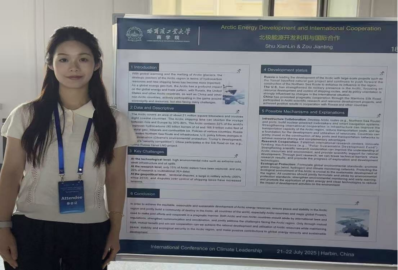 邹建婷同学参加此次国际会议并以海报形式分享了论文研究主题。该论文以北极地区能源利用和航道开发为视角,阐述了北极在全球能源和贸易格局中战略定位和深远影响,分析了以俄罗斯、美国为代表的北极国家和以中国为代表的非北极国家积极参与北极事务,以及对北极能源等资源和新航线开发主导权所展开的多轮博弈,指出北极能源开发与国际合作面临资源勘探不足、开发难度大、地缘复杂等现实挑战,并提出了实现北极资源可持续开发、构建北极命运共同体的对策建议。