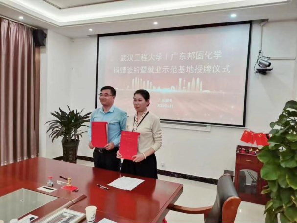 仪式上,王火利为邦固化学颁发了捐赠证书和纪念杯,陈明芳授予了就业示范基地牌匾,毕灵敏与企业主要负责人共同签订了捐赠协议。