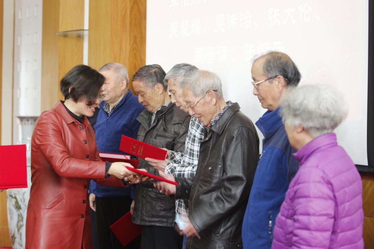 校党委副书记郑丹凤为捐赠提供各类实物的退休老师、参与迎评工作的退休老师以及档案馆的退休人员共31人依次颁发了证书。