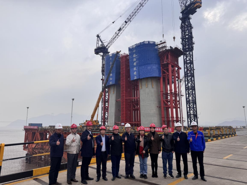 会前,成轶一行参观甬舟铁路重点控制工程西堠门大桥施工现场及项目部科技信息文化中心。