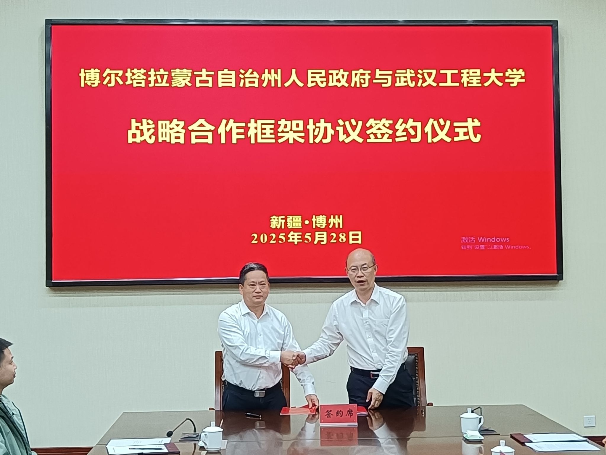 5月28日下午,调研组前往博尔塔拉蒙古自治州政府参加校地战略合作协议洽谈会,就深化校地产学研合作、推动科技创新成果转化等事宜展开深入洽谈,并签订《战略合作框架协议》。