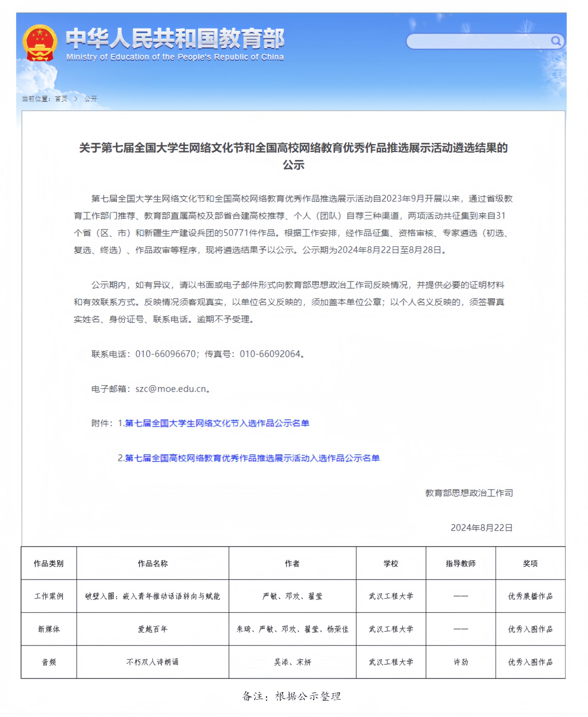 本网讯(通讯员 翟莹)近日,由中央网信办网络社会工作局、教育部思想政治工作司联合主办的第七届“全国大学生网络文化节”和“全国高校网络教育优秀作品推选展示活动”(以下简称“一节一推选”)获奖作品名单公布,我校获优秀展播作品1项、优秀入围作品2项,有力展示了我校网络思政育人成果。