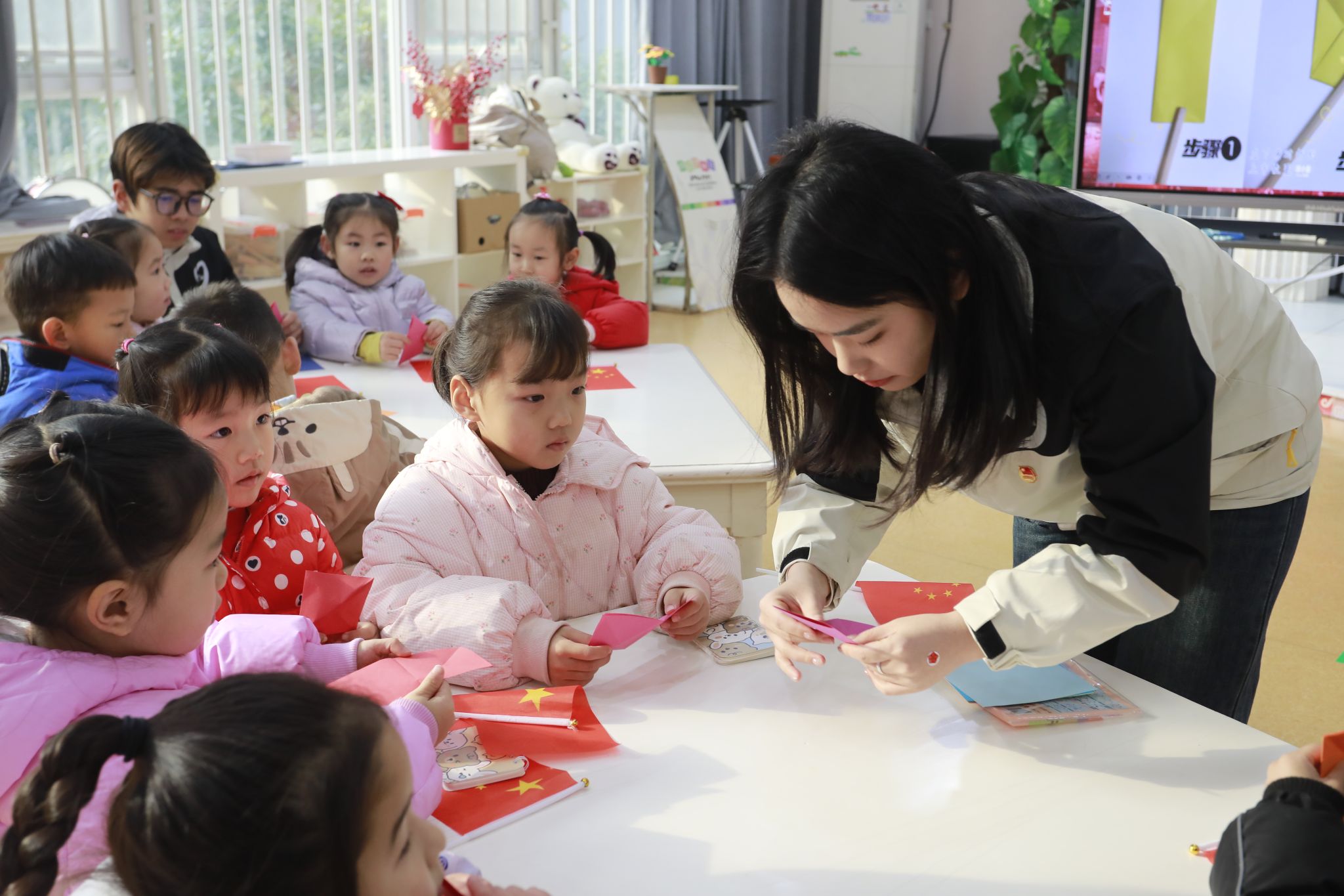 以纸为媒,五星照耀爱国情。实践团带领小朋友们学习如何折五角星,将爱国情怀融入孩子们的动手实践中。实践团成员到每一个小朋友身边,细致地演示每一个折痕的步骤,手把手地帮助孩子们掌握要领。孩子们的眼神专注而好奇,小手虽略显笨拙,却充满了学习的热情。不一会儿,一张张彩纸在孩子们的指尖翻转,逐渐变成了一个个精致的五角星,每一颗星星都闪耀着孩子们成就感的光芒。