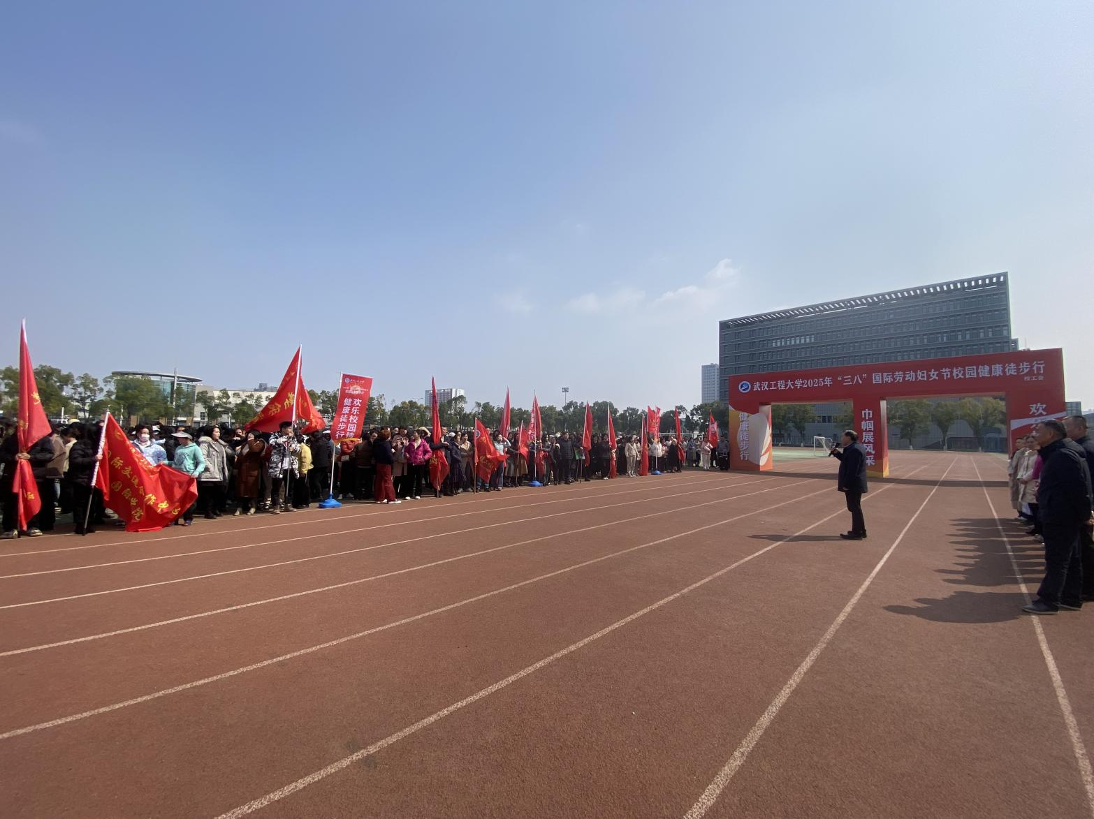 本网讯(通讯员 徐春梅 高靖)阳春三月迎芳华,巾帼英姿展风采。3月6日,在学校田径运动场,为喜迎第115个“三八”国际劳动妇女节,举办校园健康徙步行。校党委副书记、工会主席李志旭出席了开幕式并致辞,活动由工会常务副主席鲁晓君主持,相关职能部门负责人、各分党委(总支、直属党支部)书记及各分工会主席出席,1000余名女教职工参加活动。