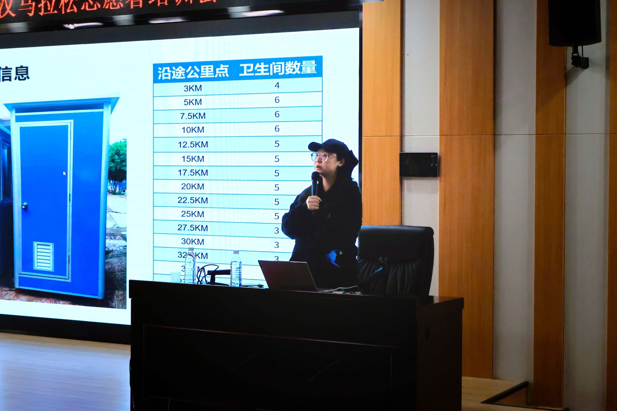 在培训会上,王梓桐详细介绍了武汉马拉松的赛事概况、不同志愿者岗位的工作内容、志愿者权益与福利、志愿者服务规范以及赛事过程中的安全意识和严禁事项,明确了各个岗位志愿者的工作职责。她强调志愿者的微笑是城市最好的名片,希望志愿者们谈吐举止礼貌得体,时刻保持微笑,向来自各地的参赛者展示大学生的优秀素养。