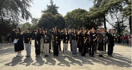 在向警予烈士陵园,全体人员整齐列队,庄严肃立。在烈士纪念碑前,敬献花篮,鞠躬默哀,表达对先烈的深切哀思与崇高敬意。在学生党员张珂莹的带领下,全体党员干部面向党旗和纪念碑,庄严宣誓,重温入党誓词。