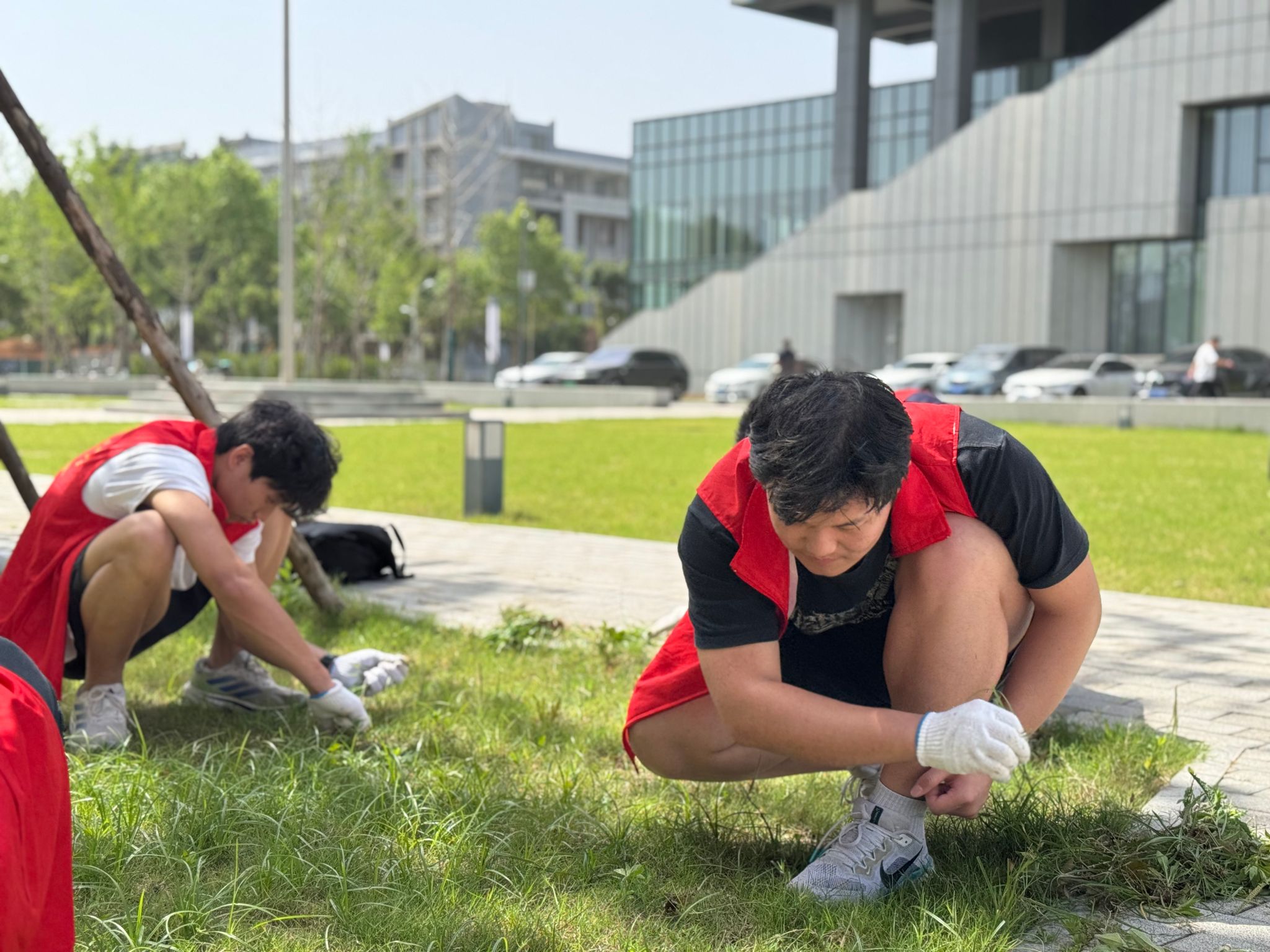 本网讯(通讯员 刘宇 熊川琦) 5月7日下午,30余名“小码农”身着红马甲,手持劳动工具,在后勤保障处专业人员的指导下,对校园绿化带、草坪等重点区域开展杂草清理,这是计算机学院与后勤保障处联合开展的“劳动砺心智 实践促成长”校园义务拔草志愿服务活动。