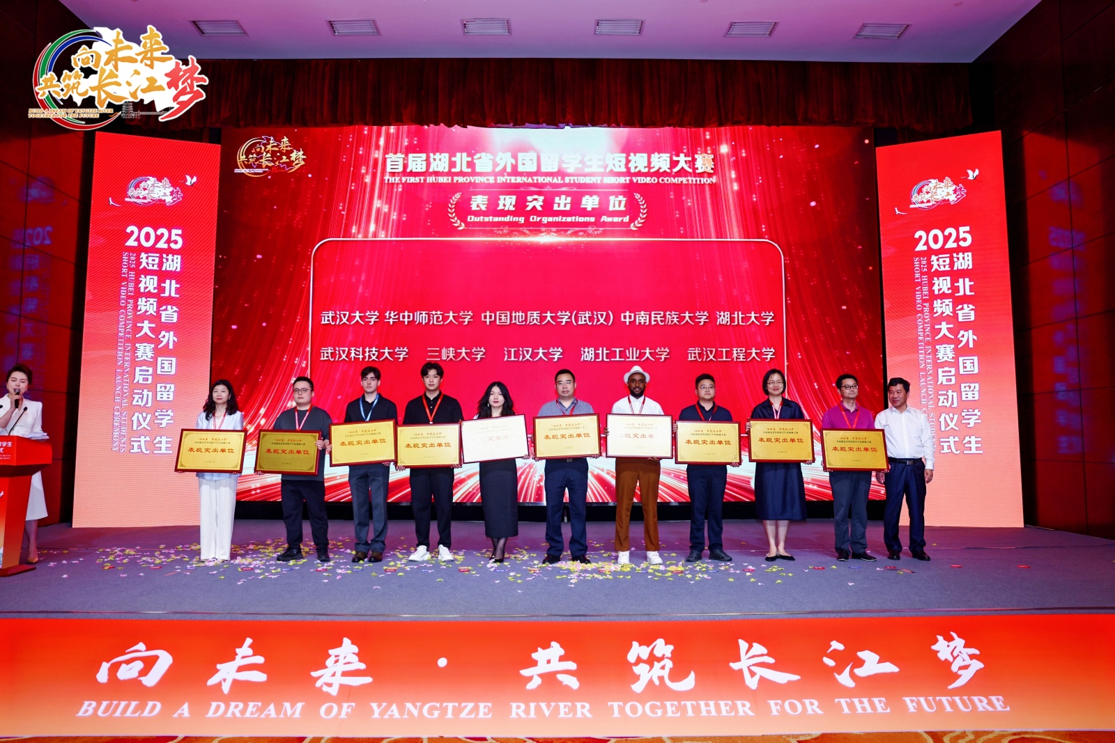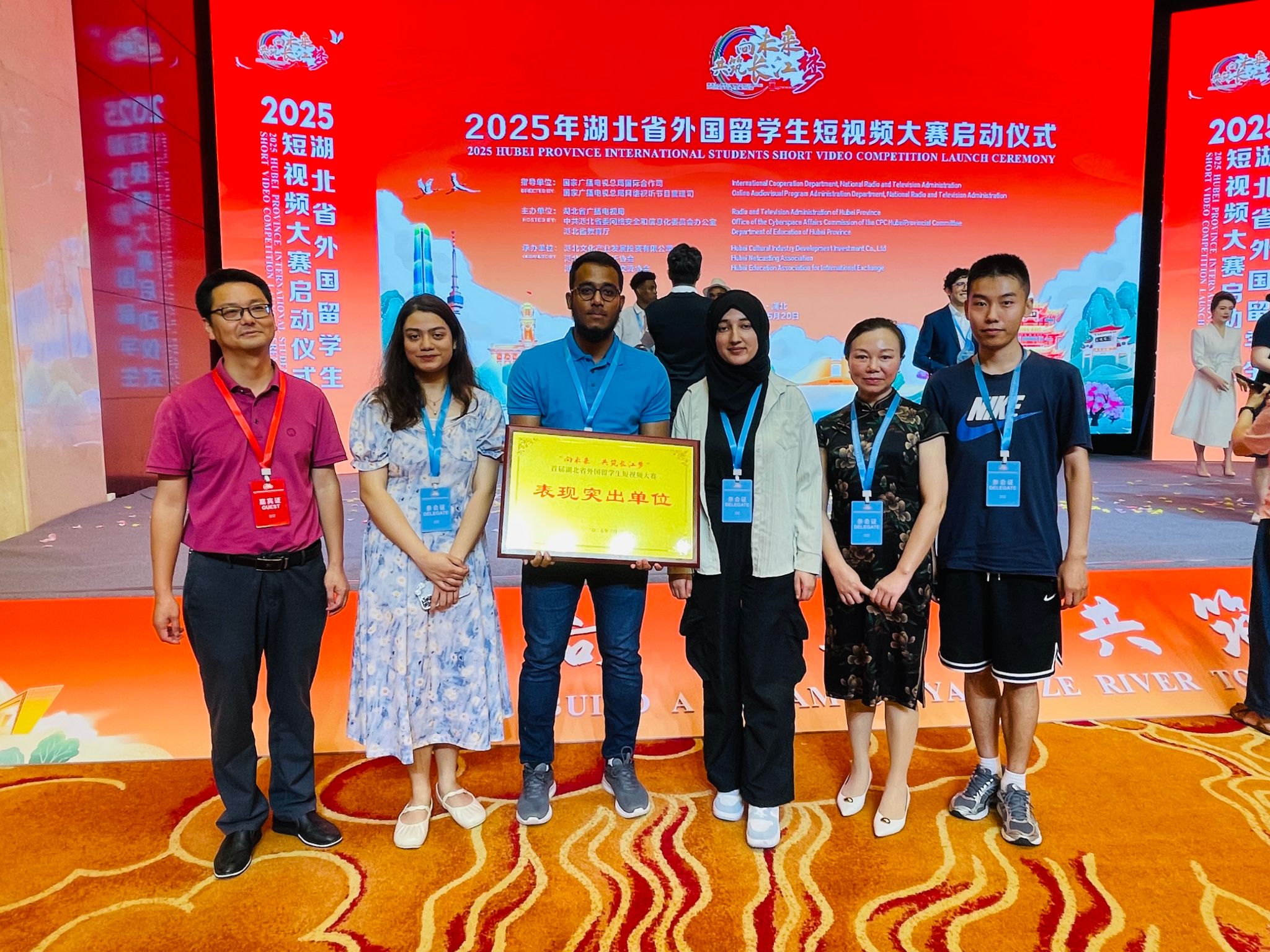 本网讯(通讯员 黄河)5月20日上午,2025年湖北省外国留学生短视频大赛启动仪式在武汉隆重举行。会上宣布了首届湖北省外国留学生短视频大赛获奖名单并举行了颁奖仪式。我校被授予“表现突出单位”奖,我校Alam Morshed等9名留学生的视频作品《长江:文明的源头和经济的脉搏》,获评优秀作品奖。