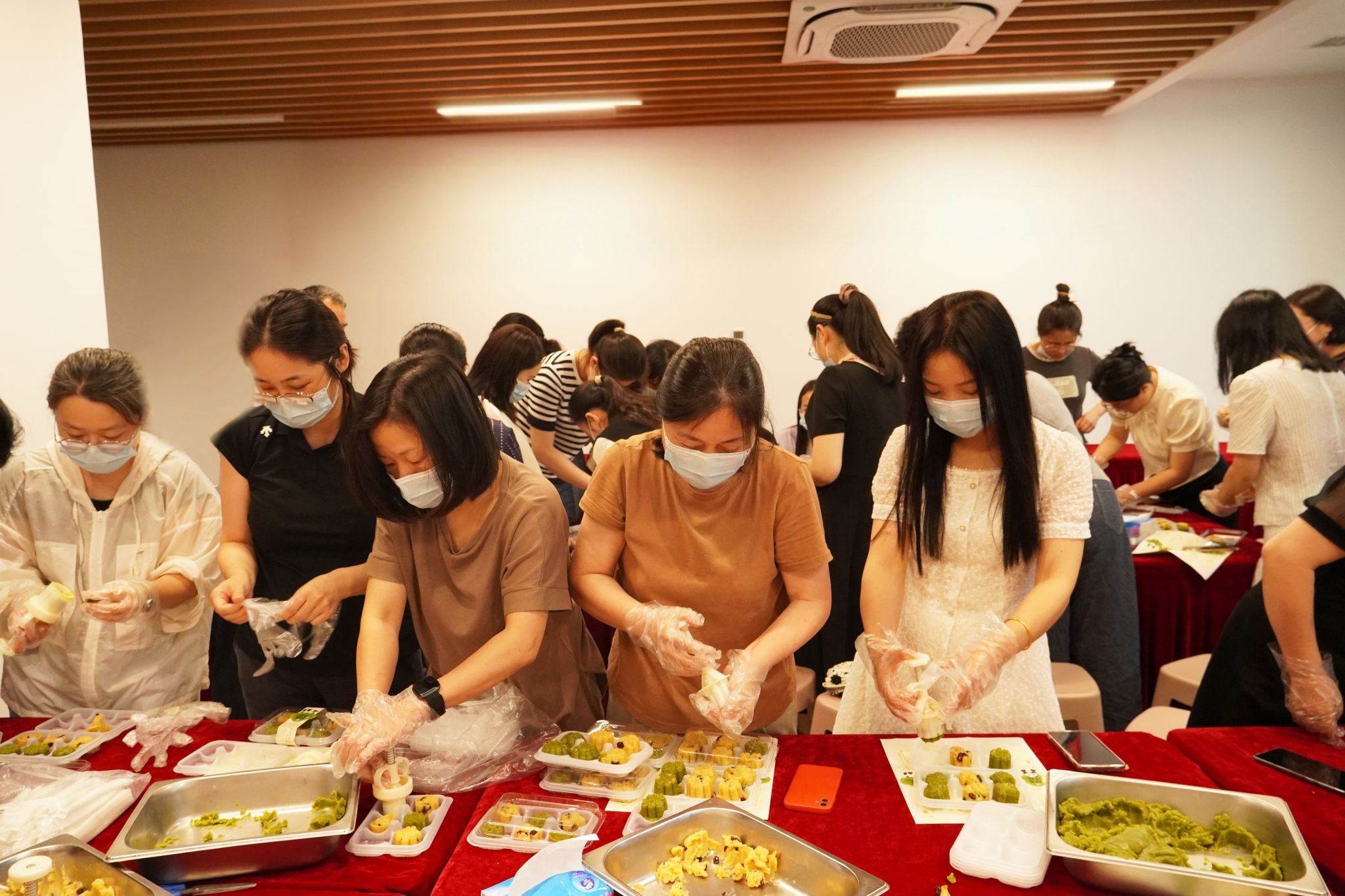 老师们认真聆听、仔细观察,理论讲解结束后,大家就迫不及待地开始动手实践。在面点师的耐心指导下,有的老师负责将绿豆泥揉搓均匀,有的将绿豆糕分线压圆,还有老师熟练地用模具将绿豆糕压制成精美的形状。老师们一边制作,一边相互交流、相互学习,分享着制作心得和生活趣事。