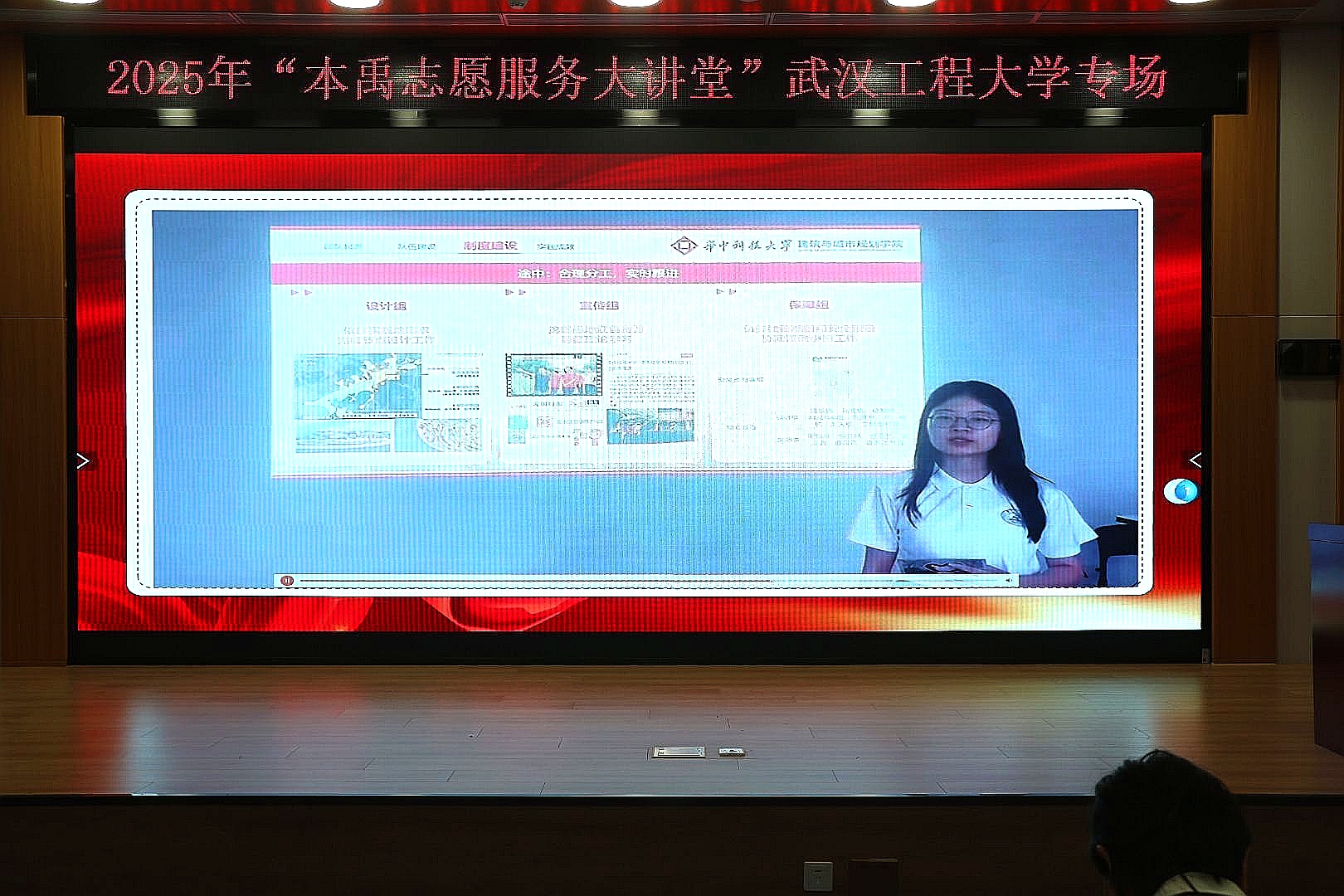 活动现场通过“艺术展演+团队宣讲”的形式展现志愿服务的魅力。活动邀请到了华中科技大学、湖北第二师范学院志愿者代表团播放录制表演视频,讲述他们的志愿服务故事。