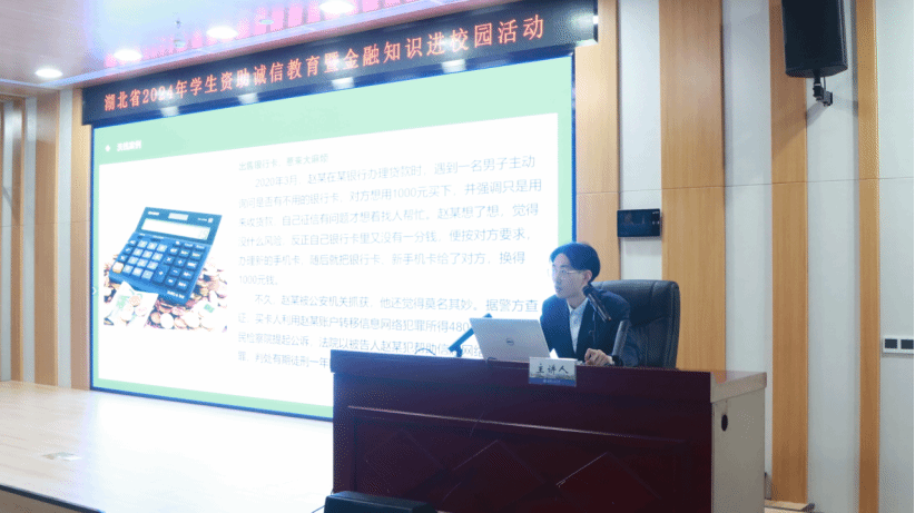 随后,国家开发银行湖北省分行陈富瑞、胡琴、徐浩洋3位专员分别以《生源地信用助学贷款政策》《普及征信知识 共建诚信社会》《拒绝洗钱 从我做起》为题,聚焦大学生群体对贷款、金融、征信、防诈知识的迫切需求和薄弱领域,通过漫画、案例等形式生动形象地为在座师生上了一堂金融知识专业课。现场师生认真聆听,受益匪浅。