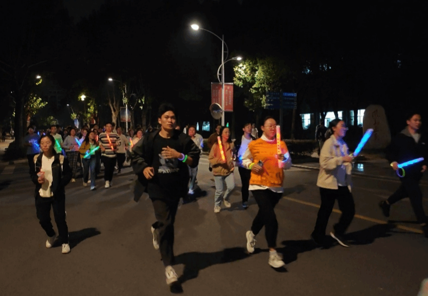 夜跑途中,师生们挥洒汗水,挥舞手中的荧光棒,尽情享受着夜跑带来的激情与欢乐,他们用荧光描绘着工大的夜,用热情尽情展现青春的活力。