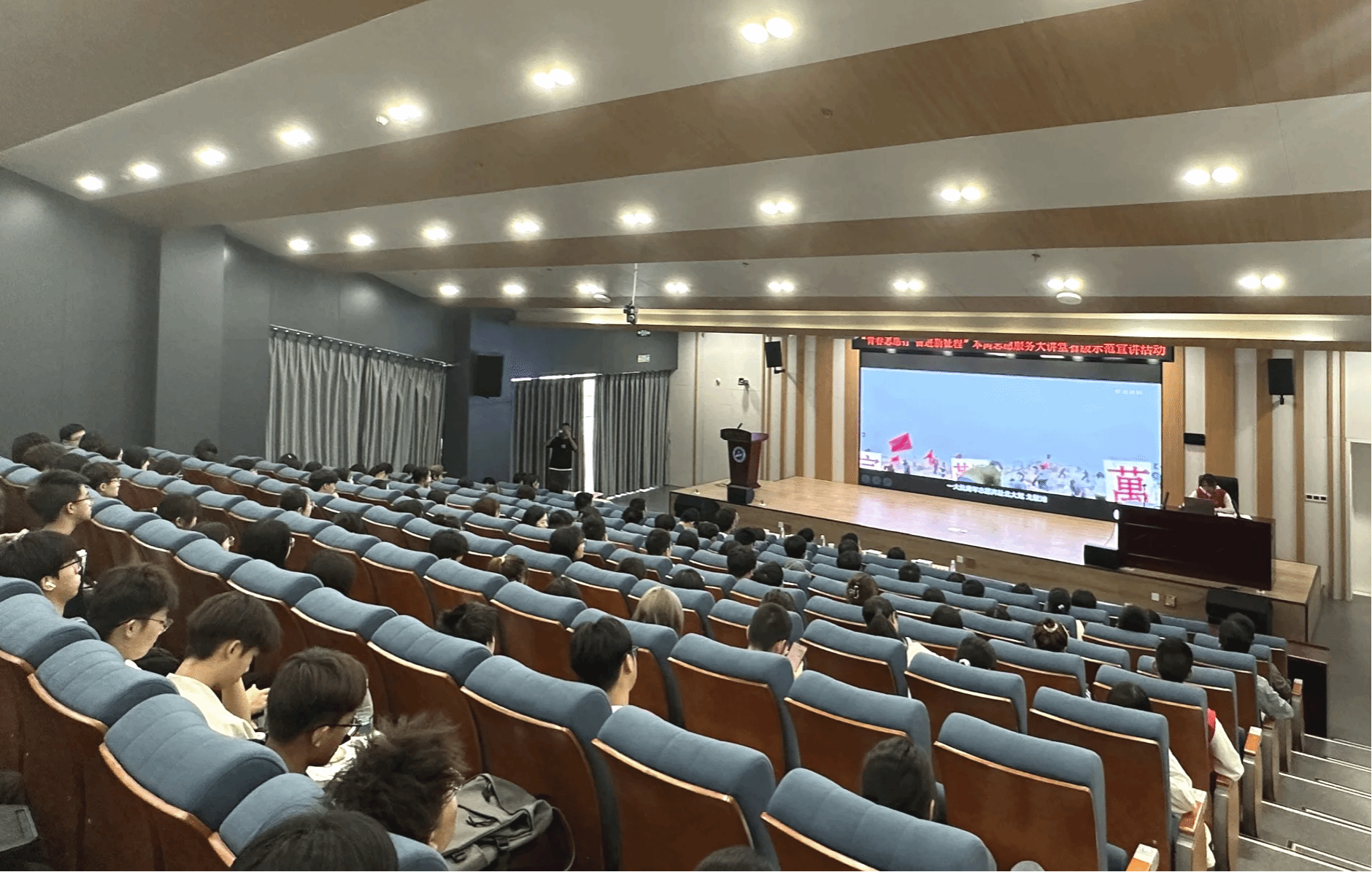 来自湖北大学“陌上花开”文化传承志愿服务队的学生负责人潘飞樊作《以青春之名,赴时代之约》专题宣讲,讲述个人携团队一起奉献青春、播撒希望、反哺社会的支教历程,彰显了新时代青年“与祖国同行,为人民奉献”的风采。