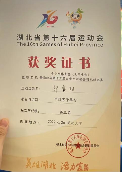 本网讯(通讯员 魏四成)6月26日,由湖北省人民政府主办,湖北省教育厅、湖北省体育局承办,湖北省大学生体育协会、武汉大学协办的湖北省第十六届运动会青少年体育类(大学生组)暨湖北省第十三届大学生运动会羽毛球比赛在武汉大学落下帷幕。我校学子郭馨阳在男单比赛中斩获第三名,张蕴月在女单比赛中获得第八名,王艺泽和郭馨阳获得体育道德风尚奖。