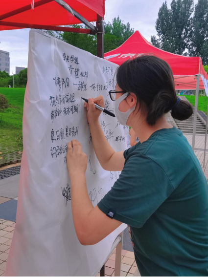 正在给毕业学子留言的志愿者李梦阳说:“毕业季,看到即将离校、步入社会的学姐学长们,看见他们在操场上身着学士服的身影,看到那张写满名字和留言的背景墙,正处大一的我感受到的不仅是他们热烈而又充实的青春,更是憧憬奋进的未来,激励着我们去追求自己心中的那份美好!”