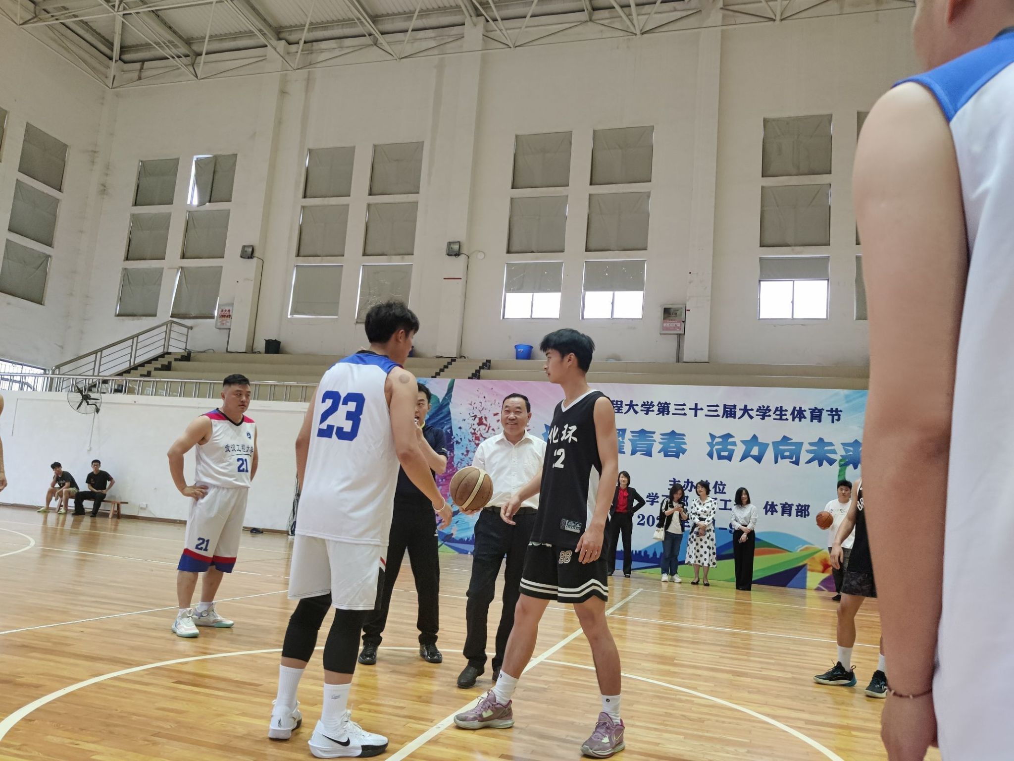 李志旭为学生、教工篮球友谊赛开球。赛场上,双方球员奋力驰骋,抢球、传球、投篮,队友间紧密配合,记分板上的数字不断变化,双方球员们愈战愈勇,上演了一场精彩绝伦的交锋。赛后,双方参赛选手进行了合影留念。