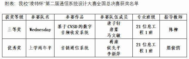 本网讯(通讯员 陈柳)近日,第二届“凌特杯”通信系统设计大赛在西安电子科技大学圆满落幕,我校首次参赛的两支队伍在全国总决赛中表现突出,分别荣获三等奖和优秀奖。