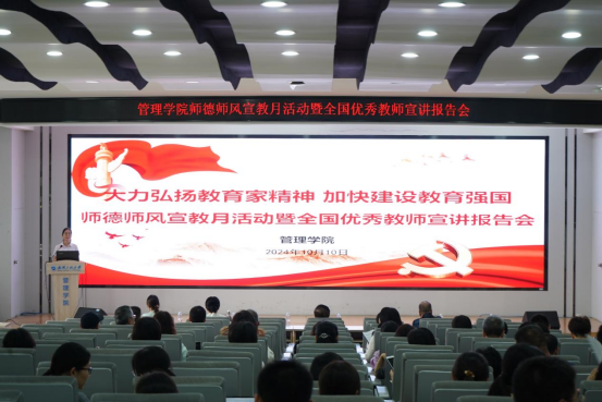 本网讯(通讯员 李梓煜)10月10日下午,管理学院举办师德师风宣教月活动暨全国优秀教师宣讲报告会,学院领导班子成员、全体教职工参会,会议由管理学院党委副书记罗琼主持。